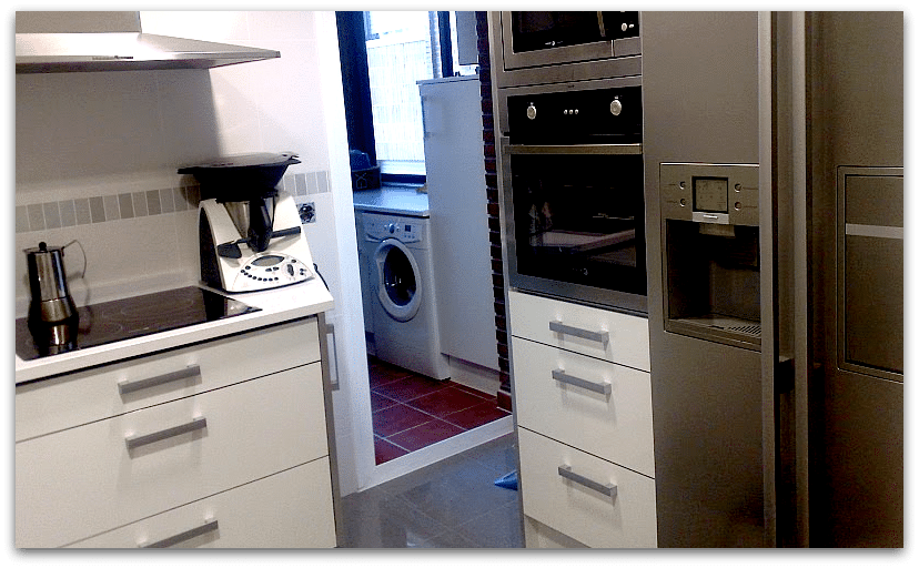 Me gusta mucho esta cocina; en muy poco espacio, se puede aprovechar bastante lo que hay. Además, el blanco le aporta mucha luminosidad y el brillo también. yo también la quiero blanca, pero estoy pensando en el granito negro en lugar de silestone, puesto que lo hay en granito, y es menos problemático. Ya veremos qué pasa, aún me quedan unos meses.