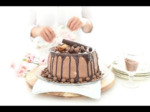 Receta de Tarta de chocolate "dripping cake", una tarta de 3 pisos, con crema de mascarpone, plátano y crema de mantequilla. Una bomba deliciosa.